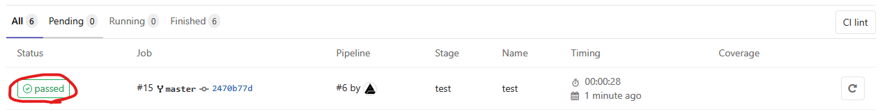 결과는 저장소 > CI / CD > Jobs > 보고 싶은 것의 Status 버튼을 클릭하면 됩니다.