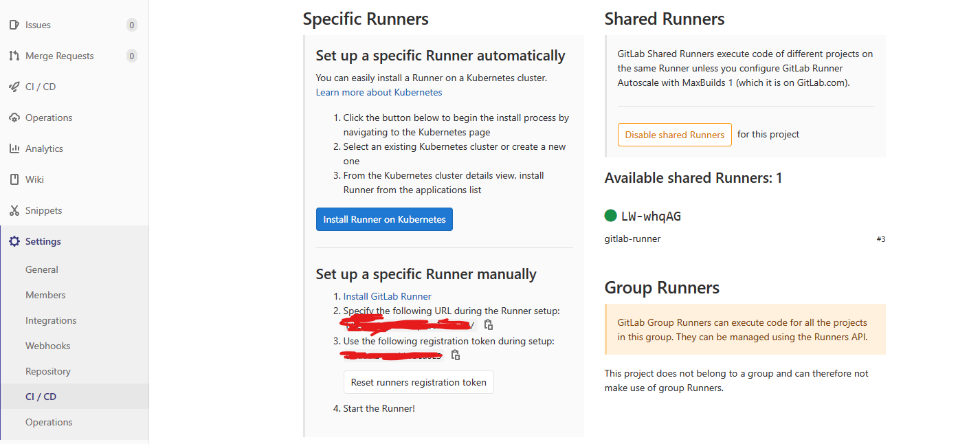 먼저 Specific Runners 는 특정 저장소에 국한된 러너를 뜻합니다.Shared Runners 는 따로 러너가 설정되지 않은 저장소에서 쓰입니다.